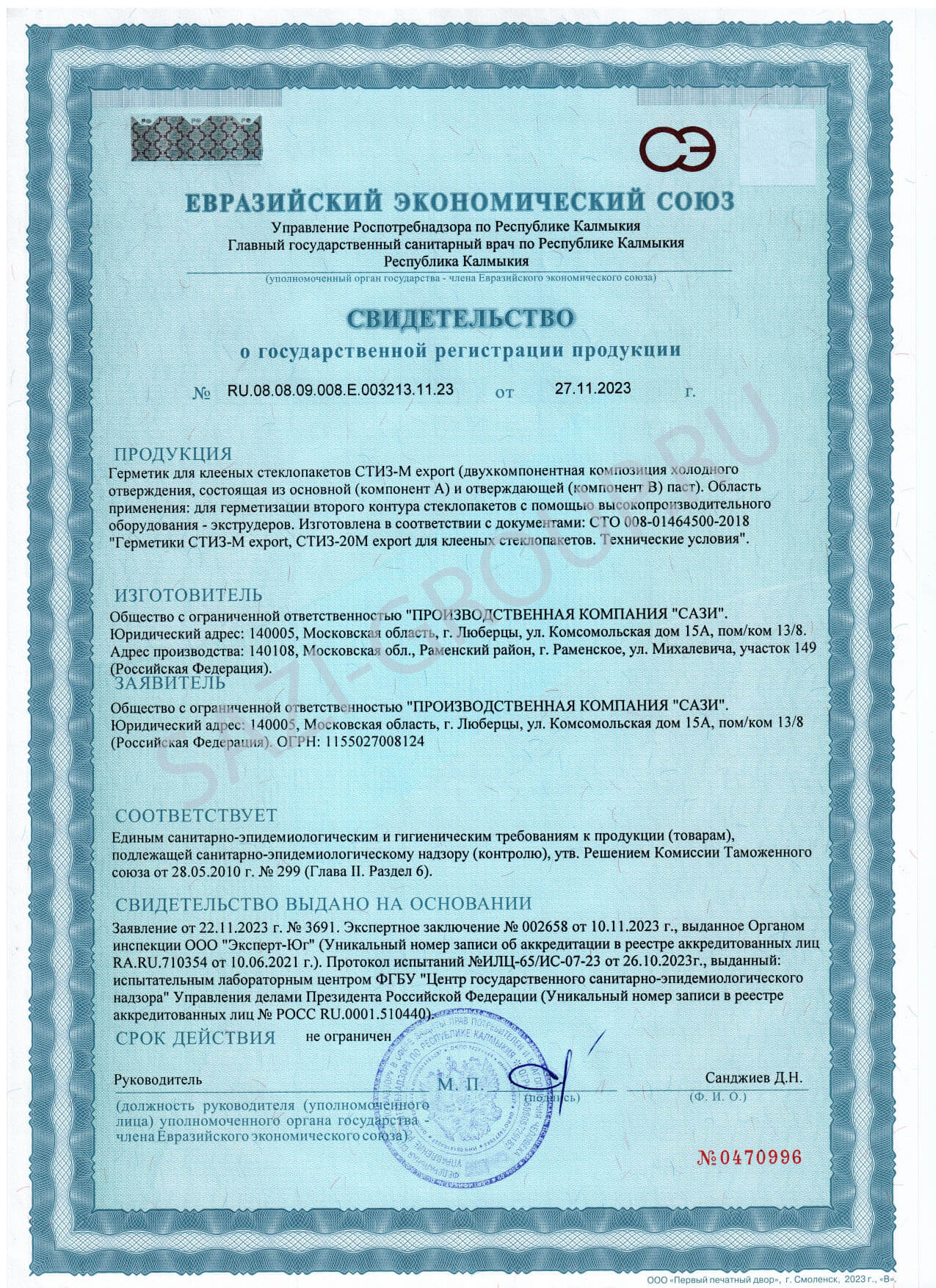 • Свидетельство о госрегистрации Свидетельство о госрегистрации Сазиласт 13 Свидетельство о госрегистрации Сазиласт 13