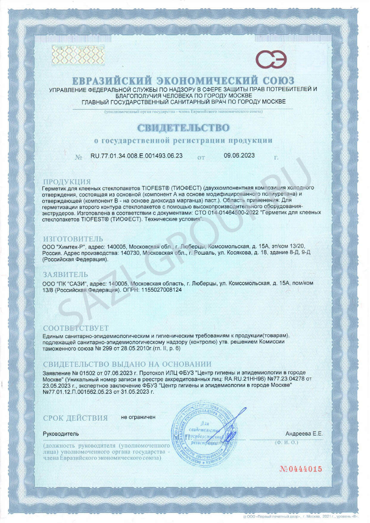 • Свидетельство о госрегистрации Свидетельство о госрегистрации Сазиласт 502 Свидетельство о госрегистрации Сазиласт 502
